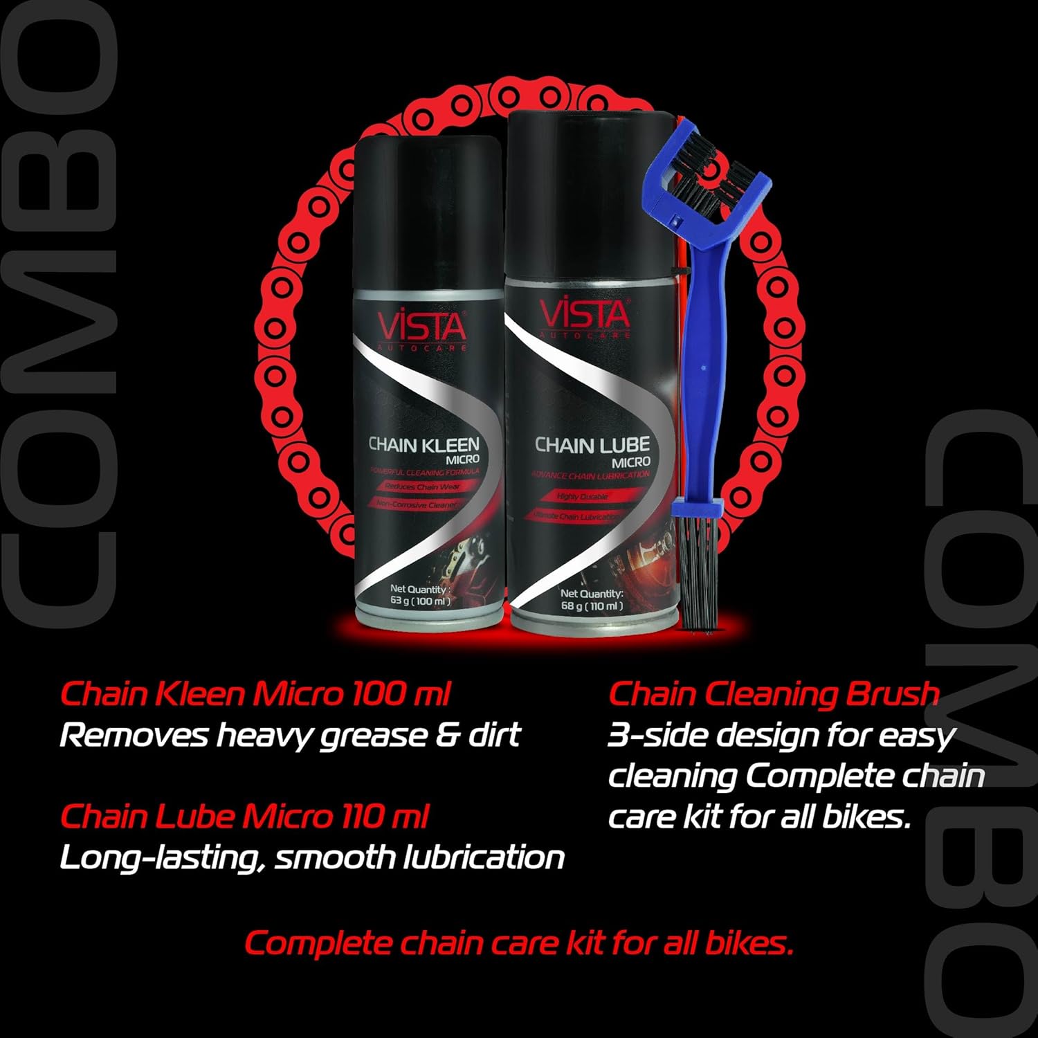 - Complete Chain Care: Chain Kleen 100 ml + Chain Lube 110 ml + brush included.